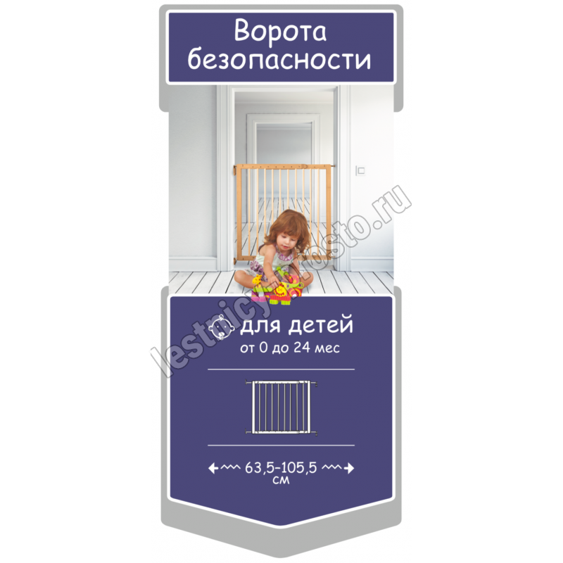 Изделие имеет раздвижную конструкцию с большим диапазоном - от 63.5 до 105 см и может быть установлено в любые дверные или лестничные проемы, в качестве основного материала используется натуральное дерево (бук) с высококачественной шлифовкой.