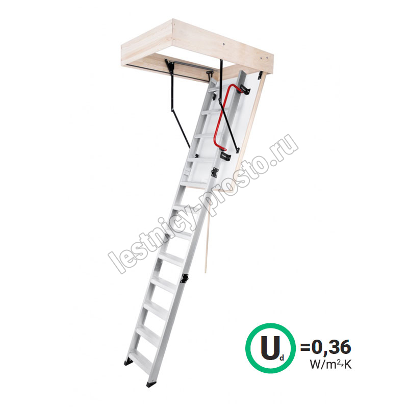 Складная 3-х секционная (до 2800 мм) или 4-х секционная (до 3500 мм) чердачная лестница. Рабочая поверхность полностью выполнена из алюминия. Термоизоляционная крышка типа "сэндвич" имеет усиленную теплозащиту, облицована с двух сторон ДВП белого цвета. По контуру короба имеется уплотнитель;