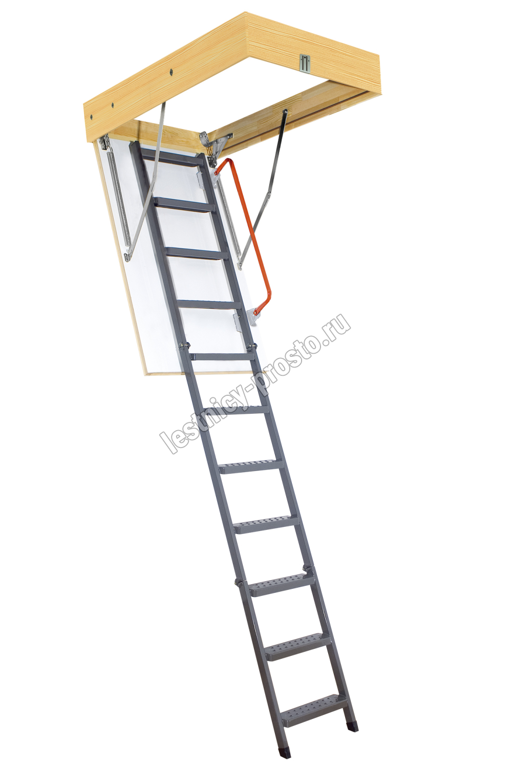 Чердачная металлическая лестница LMK – это надежная складная конструкция, состоящая из марша и термоизоляционной крышки, изготовленной из ДВП и окрашенной в белый цвет.