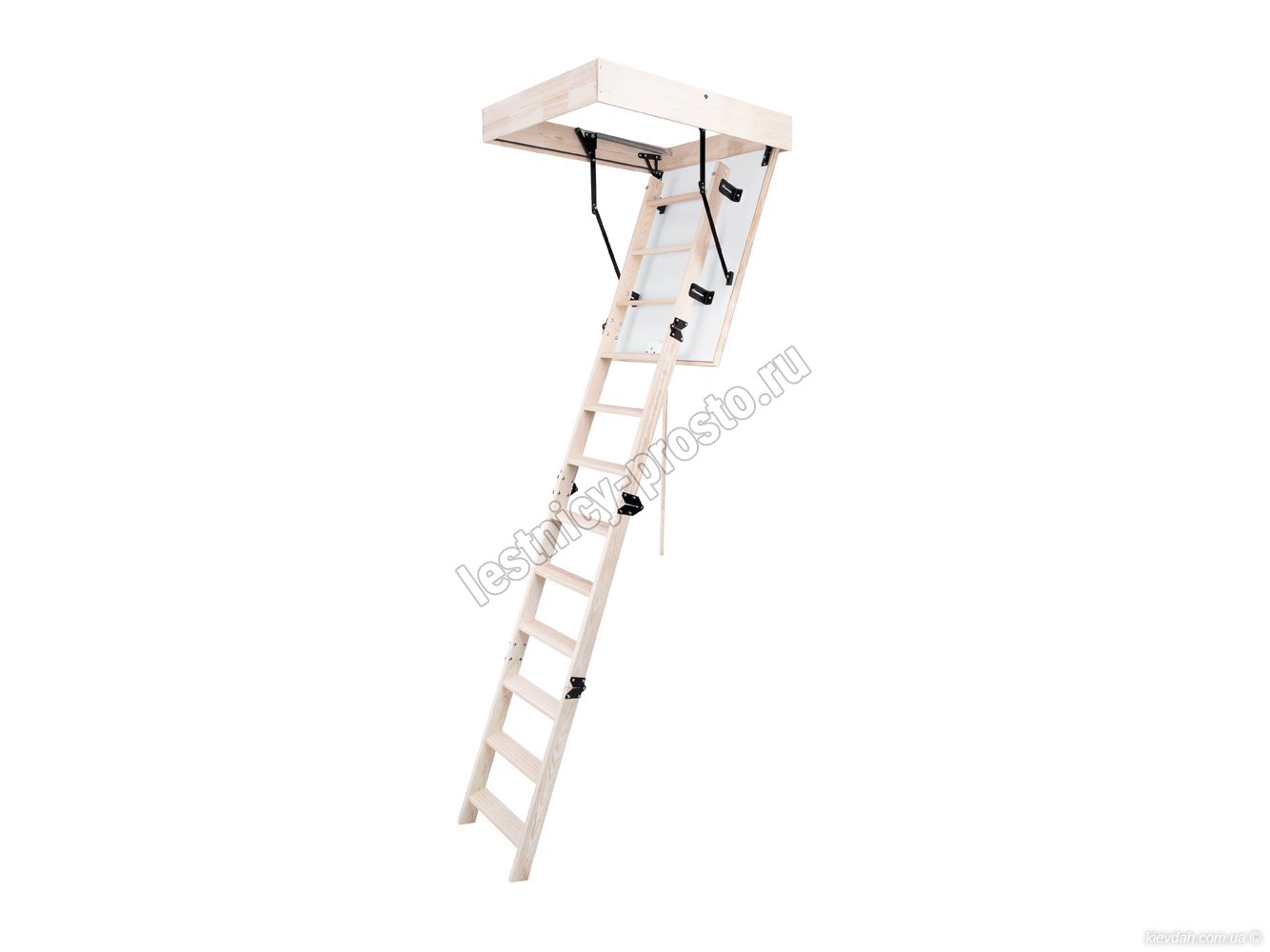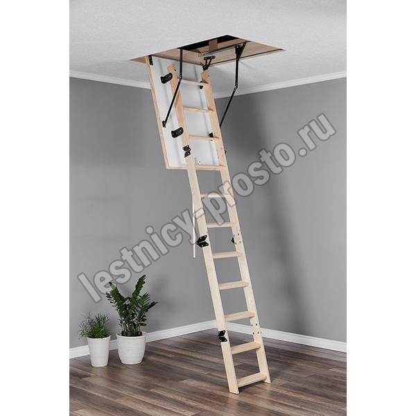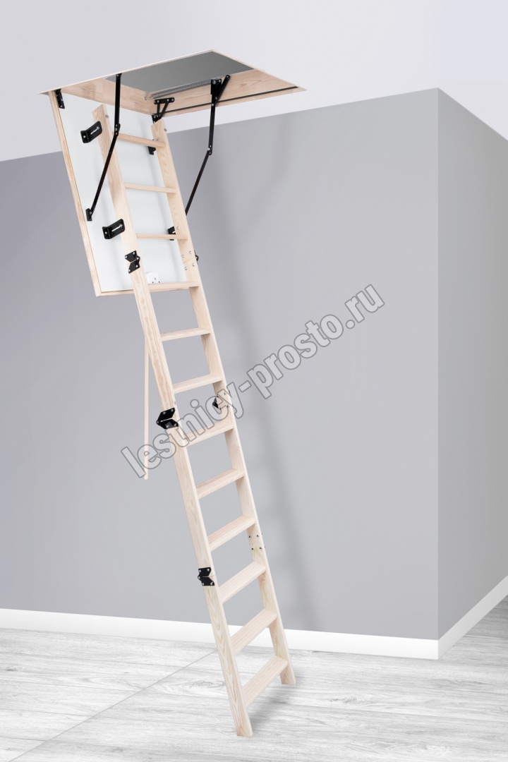 Лестница складная четырехсекционная, изготовлена из массива сосны. Термоизоляционная крышка типа "сэндвич" утеплена пенопластом толщиной 20 мм, облицована с двух сторон ДСП белого цвета