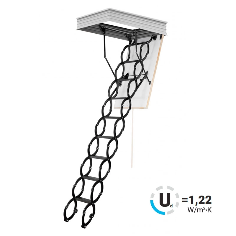 Лестница складная трёхсекционная, изготовлена из сосны. Термоизоляционная крышка типа "сэндвич" утеплена пенопластом, облицована с двух сторон ДСП белого цвета. Короб люка с однослойным уплотнителем. Все металлические элементы лестницы покрыты порошковой краской, ступени лестницы имеют антискользящие насечки и закреплены в столярное соединение «ласточкин хвост», что позволяет выдерживать нагрузку до 150 кг. Деревянный стержень для открывания лестницы в комплекте.