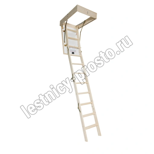 Четырехсекционная складная лестница из ели. Высота лестницы от потолка до пола: 2870 мм, с помощью дополнительной секции можно увеличить высоту до 3300 мм
