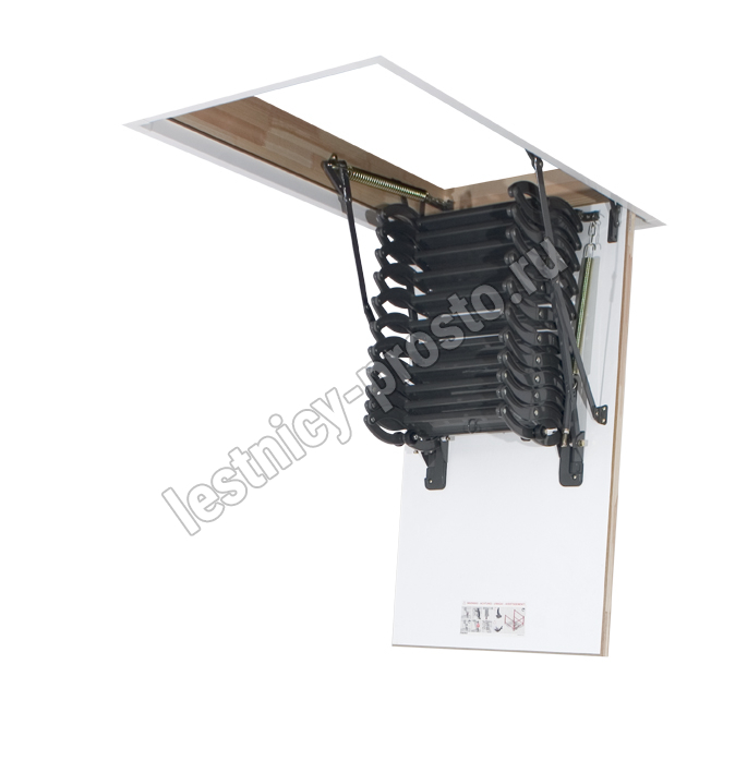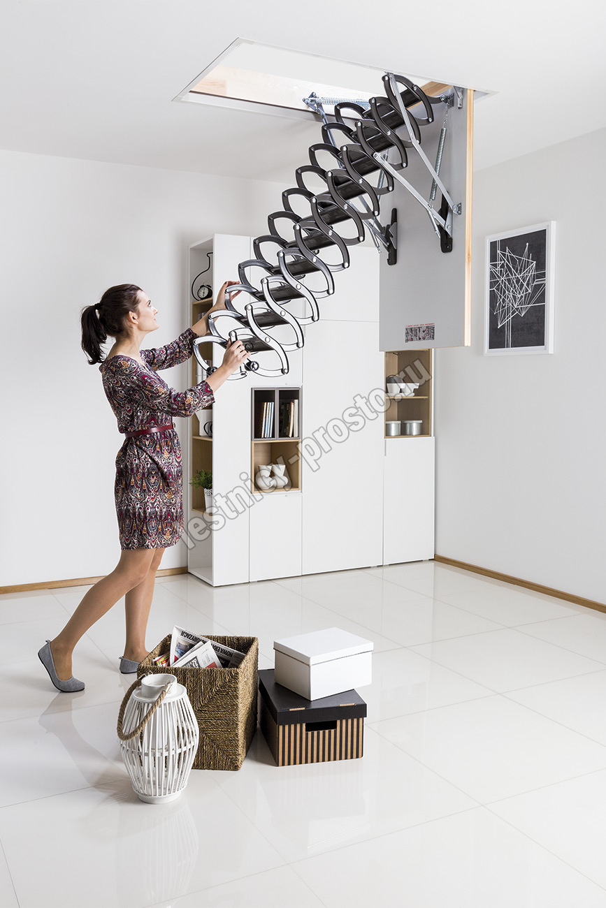 Металлическая чердачная лестница LST оснащена энергосберегающей термоизоляционной крышкой люка белого цвета. По периметру люка установлен контур уплотнения, обеспечивающий высокую степень герметичности. Благодаря «ножничной» системе складывания в сложенном виде лестница очень компактна и имеет небольшой размер крышки люка. S-образные боковые элементы лестницы выполняют роль поручней и придают лестнице современный вид.