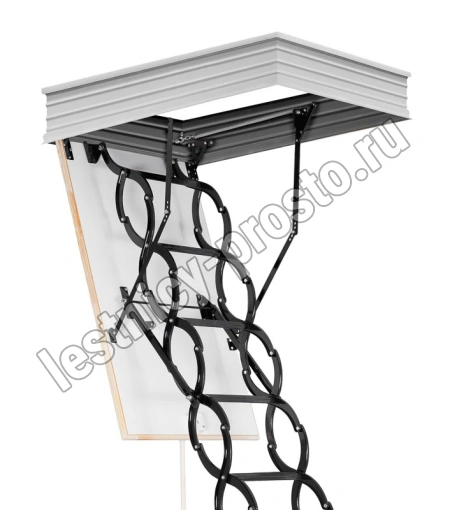 Все элементы лестницы выполнены из экологически чистых материалов и обработаны веществами, не содержащими тяжелых металлов. На ступенях антискользящие насечки. Короб лестницы изготовлен из металла. Термоизоляционная крышка типа "сэндвич" утеплена пенопластом, облицована с двух сторон ДСП белого цвета. Короб люка с уплотнителем. В комплекте деревянный стержень для открывания лестницы.