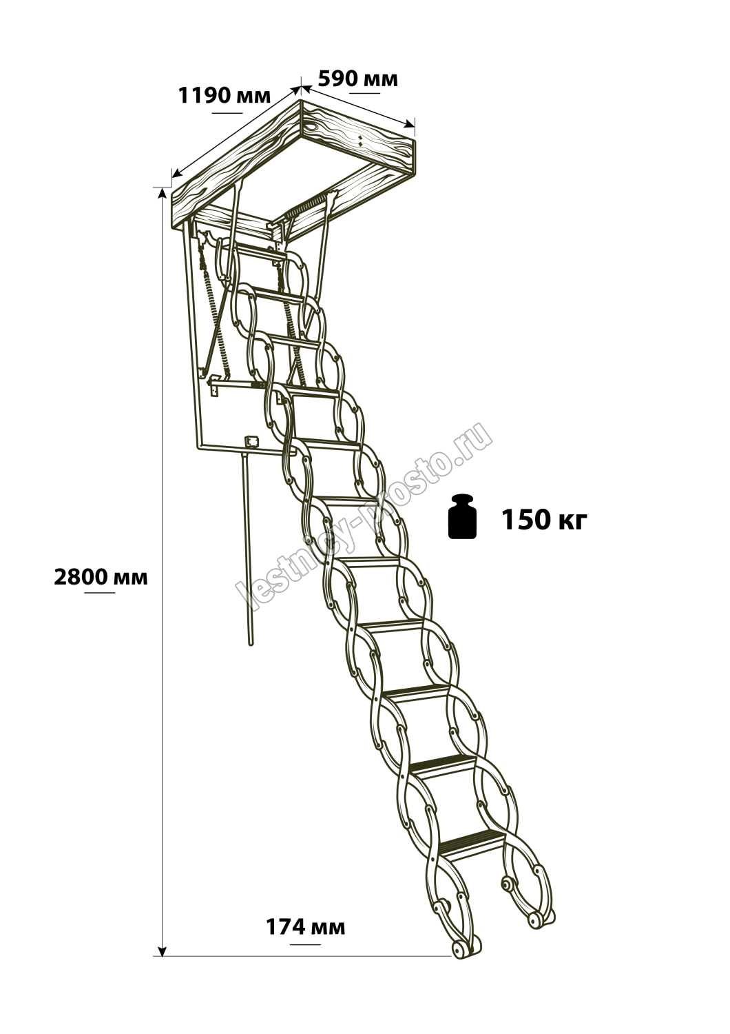 • Материалы: корпус и утепленный люк из древесины хвойных пород с теплоизоляцией из пенопласта; ступени и тетивы из металла для максимальной прочности.