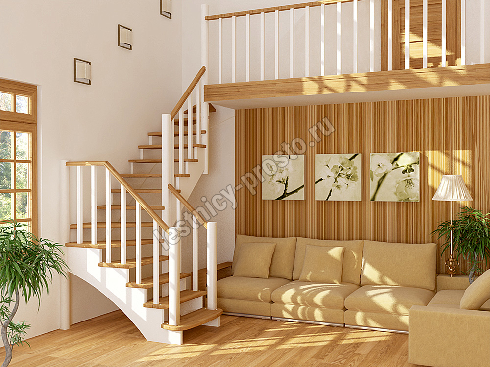 Ступени и поручень лестницы выполнены из дуба, остальные элементы из сосны.