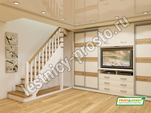 Ступени и поручень лестницы изготовлены из ясеня, остальные элементы из сосны.