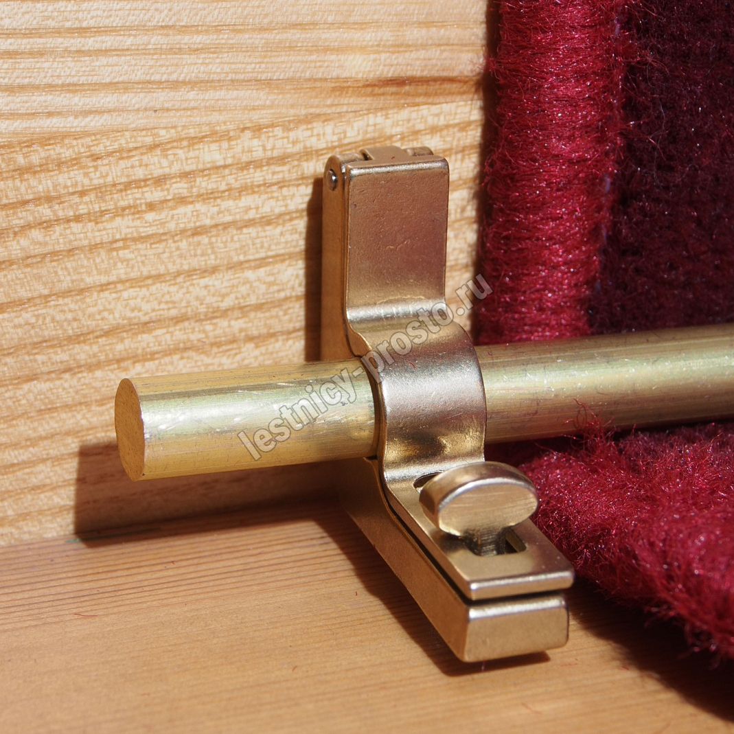 Ковродержатель комплектуется двумя держателями из латуни цвета золото, а также цельным прутком из латуни длиной от 201 до 250 см. Конструкция является сборно-разборной не требующей демонтажа креплений, что делает ее долговечной и очень удобной для чистки ковров и ковровых покрытий.