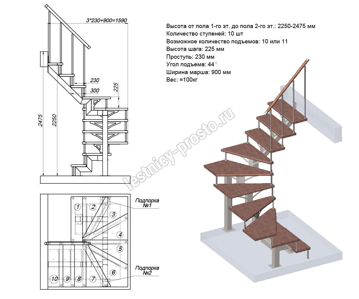 Высота лестницы 2250 - 2475 (10 ступеней) мм