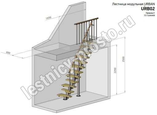 Лестница Prosto Urban Black гусиный шаг 700 мм с поручнем ПВХ, h180-264 см (10 ступеней), ясень