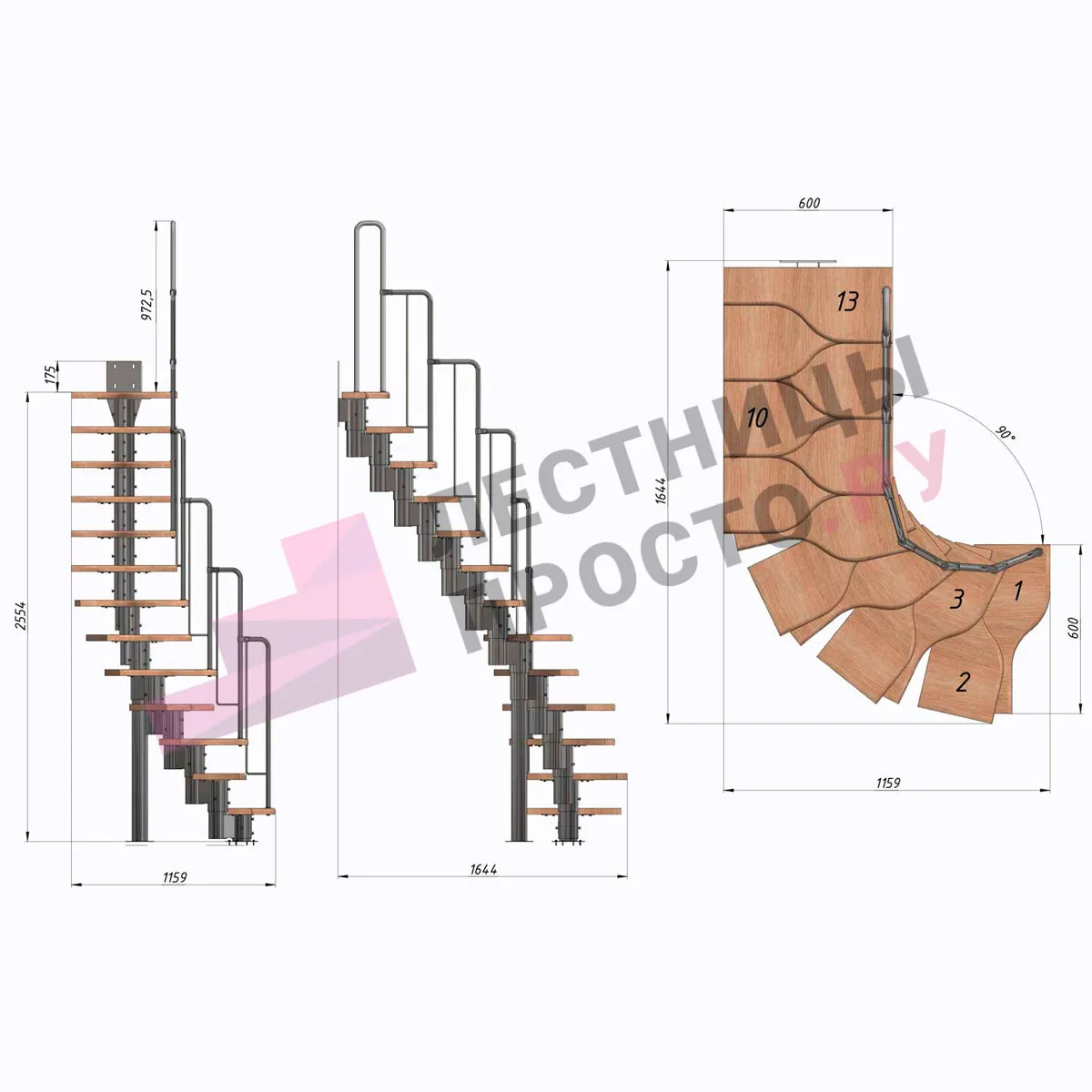 Лестница Prosto Urban Grey г-образная гусиный шаг 600 мм, h234-336 см (13 ступеней)