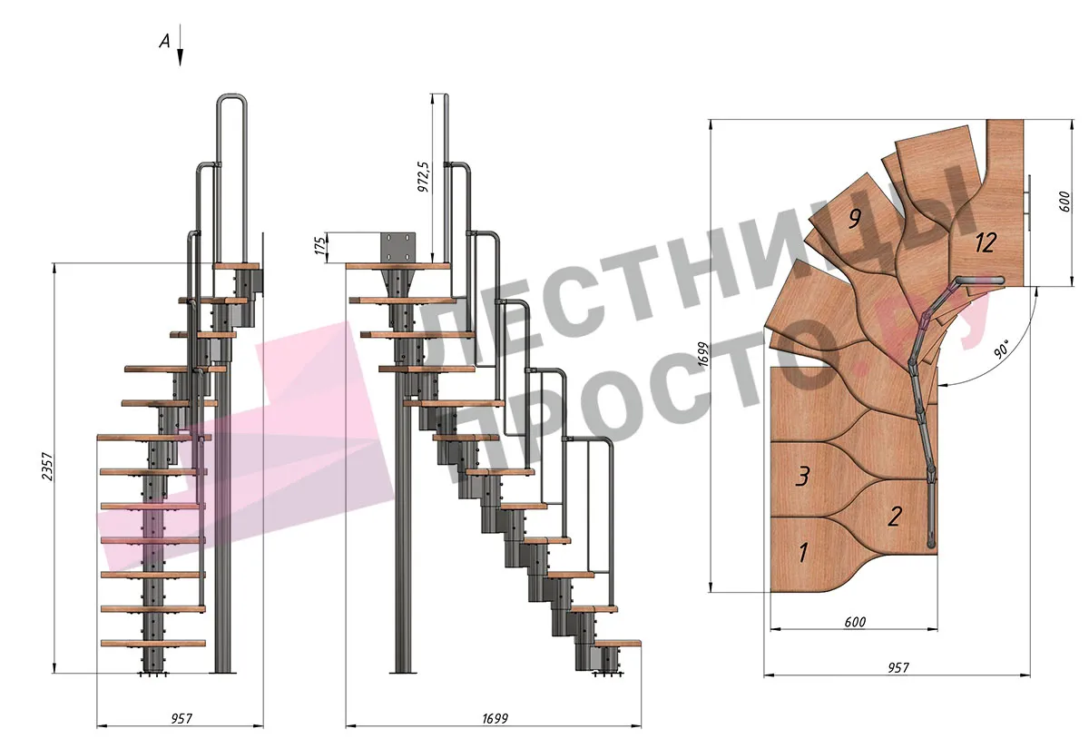 Лестница Prosto Urban Grey г-образная гусиный шаг 600 мм/ Ступени из берёзы мультиплекс